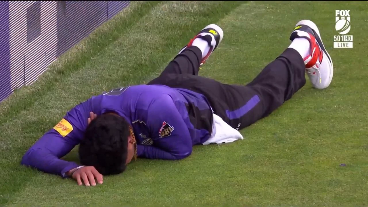 Hobart Hurricanes player Nikhil Chaudhary was forced off the field after picking up an injury while trying to take a catch near the boundary.