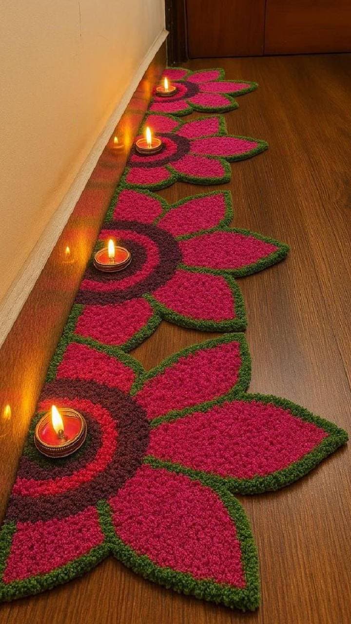 If you want to make the balcony beautiful, buy a floral circle design rangoli mat. It is quite big and its spiral look looks beautiful.