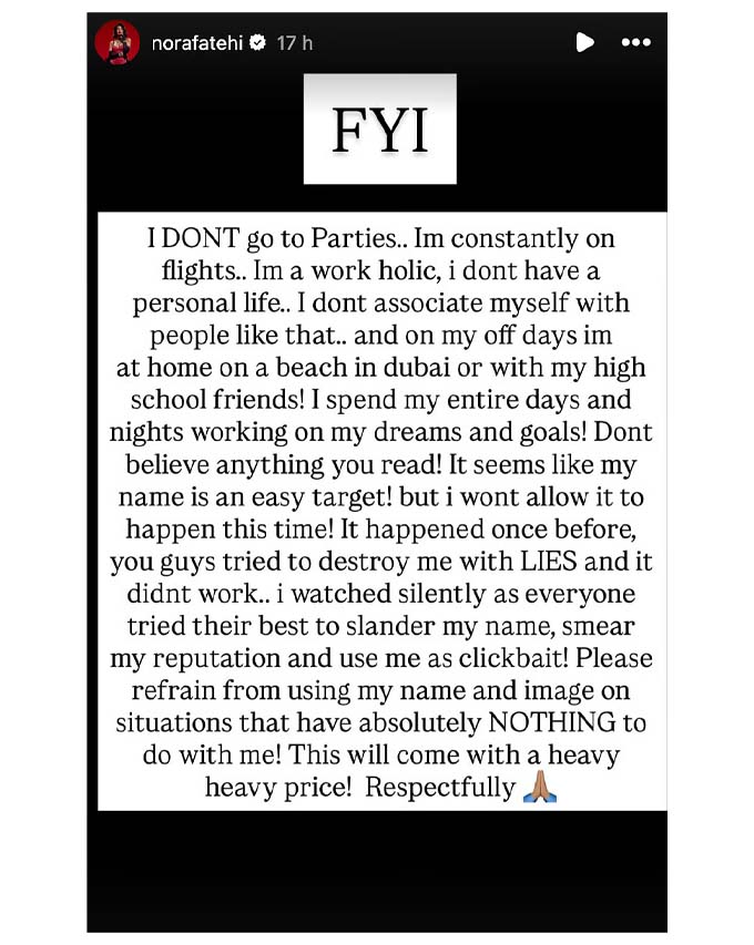 With a clear and firm statement of her own, Nora Fatehi clamped down on misinformation and reminded everyone that responsible media and fact-based discussions are of utmost importance in a world where narratives can change within minutes.