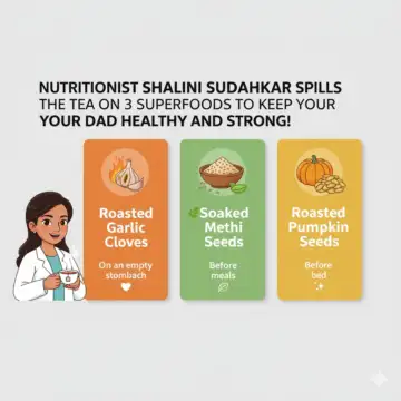 In a November 4 Instagram post, nutritionist Shalini Sudhakar shared her advice on improving men’s health through the daily consumption of three superfoods. According to her, you should ask your father to consume roasted garlic cloves first thing in the morning on an empty stomach to reduce cholesterol and protect heart health, as roasting them in ghee activates the beneficial allicin compound.