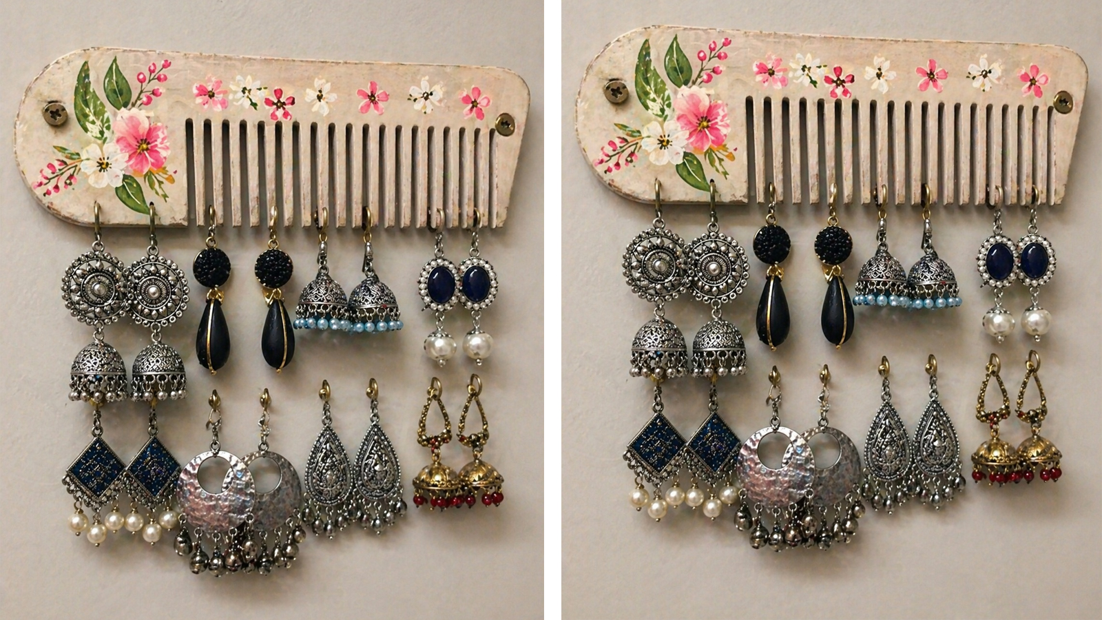 You can also make a beautiful jewelery holder with a comb. Fix your wooden comb on the wall, you can also add some color and detailing to it if you want. In this you can hang your small earrings and small jewellery. With this, they will not get entangled with each other and you can easily remove them when you want to wear them.