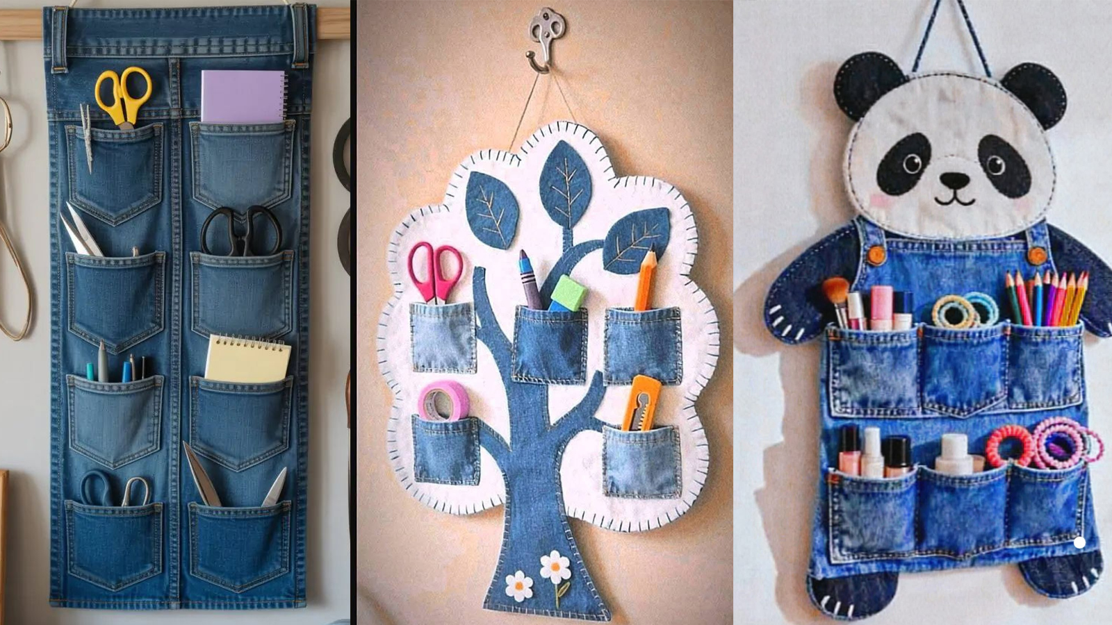 If you have a lot of denim lying around, cut off the pocket portion of the jeans and sew it onto a board or cloth. Tie a rope on it, so that it can be hung on the wall. Children can store their crayons, brushes and small toys in it.
