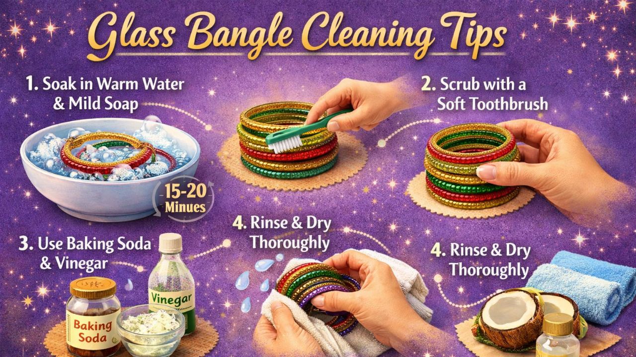 The easiest way is to mix mild liquid soap in lukewarm water and soak the bangles for 10-15 minutes. After this, clean it gently with a soft brush. With this, the accumulated dirt gets removed easily and the bangles start shining again.