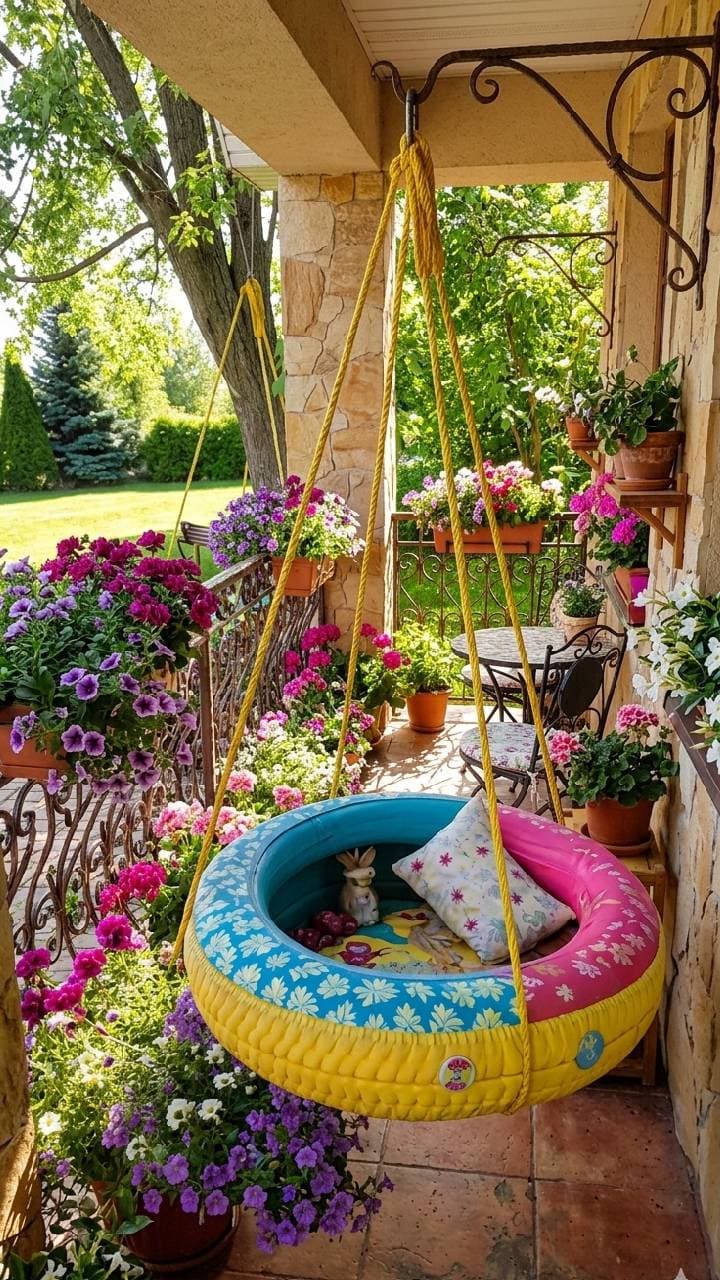 A planter can also be made from old tyres, which enhances the beauty of the house. Install waterproof ply in the base under the tire and make a hole in it.