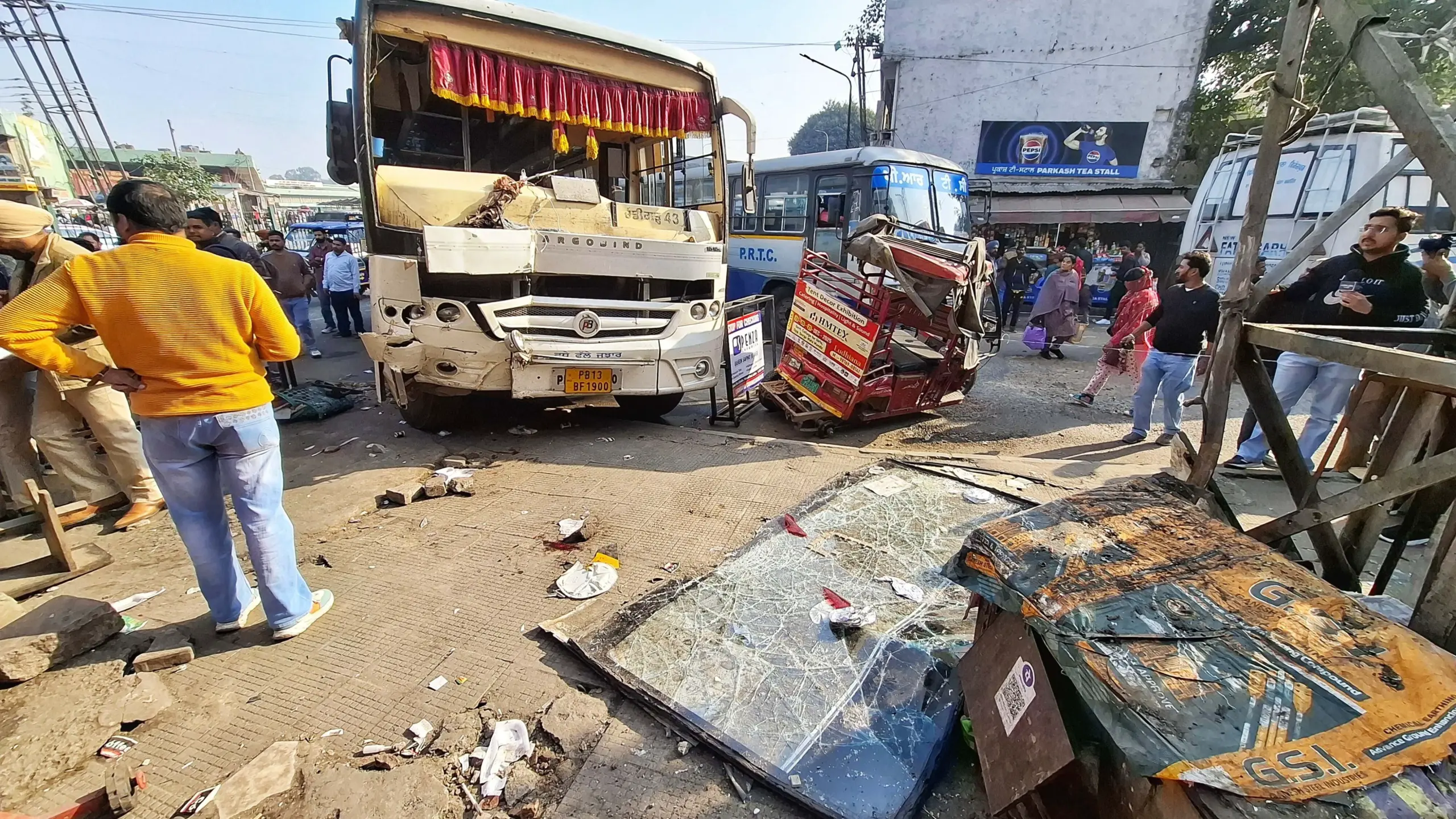 On its way from Nangal to Ludhiana, the bus hit a motorcycle, e-rickshaw, other vehicles and pedestrians before climbing a footpath in front of Hotel Palm Inn outside the bus stand.