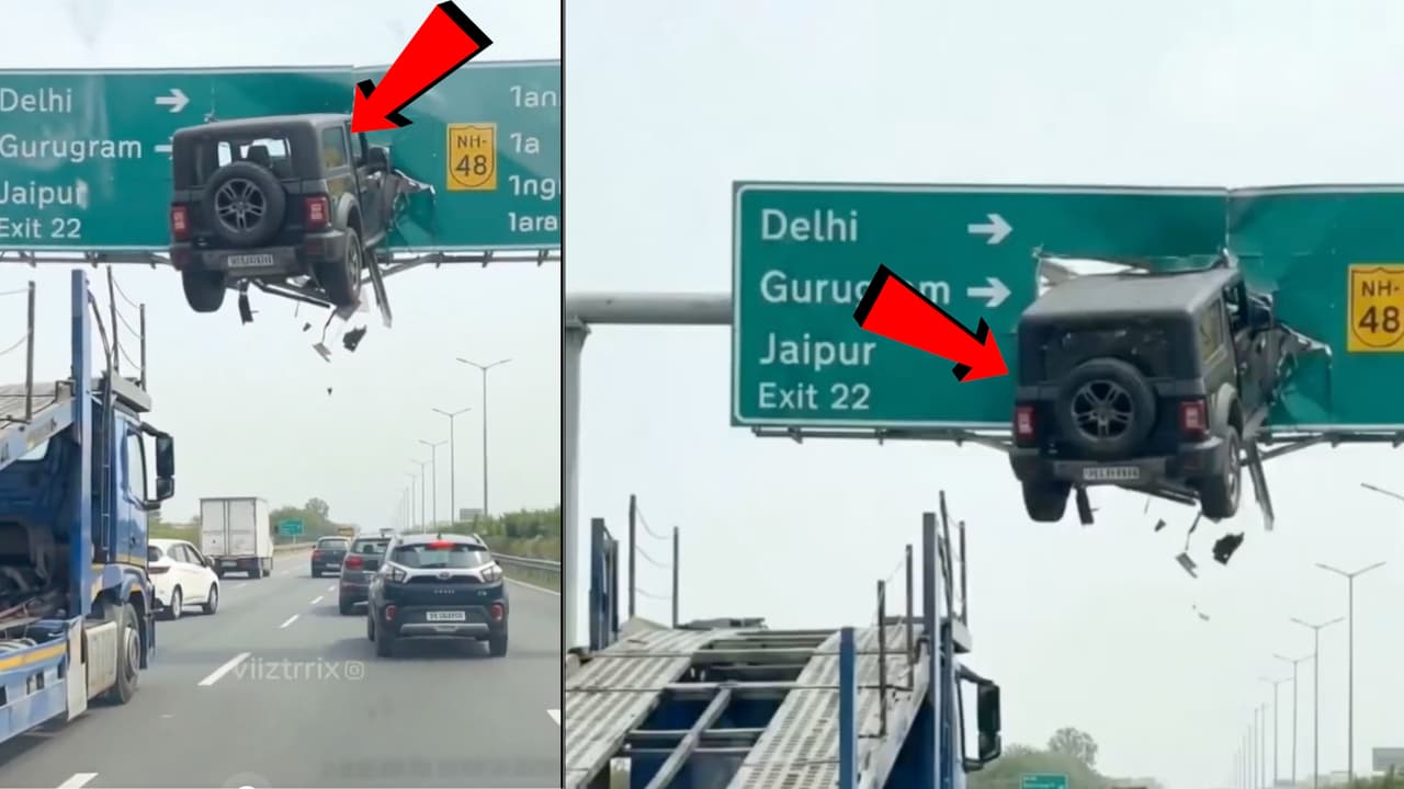 Only Thar can do this feat, it was directly inserted into the sign board – WATCH VIDEO | Nh 48 Viral Video Did A Speeding Thar Crash Into A Signboard On Delhi Gurugram Highway