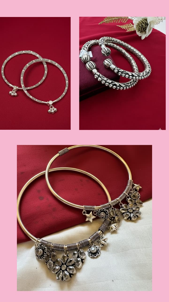 If there is a fear of losing anklets then eliminate it and include adjustable Kada anklets in your jewelery collection. The silver Kada has oxidized motif with pendant on the edges, which is adding to the beauty.