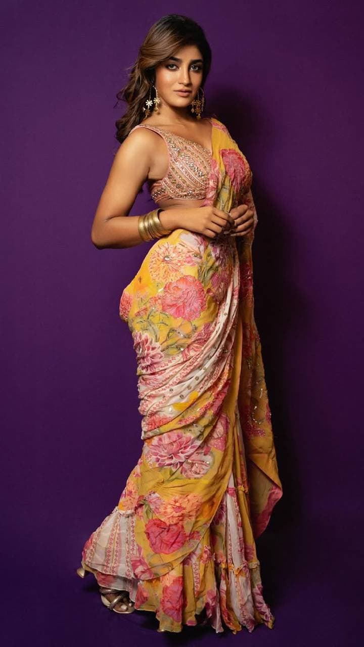 Instead of choosing only yellow saree on Basant Panchami, choose different options with added colors. Pink, green and yellow floral print saree is the best option.