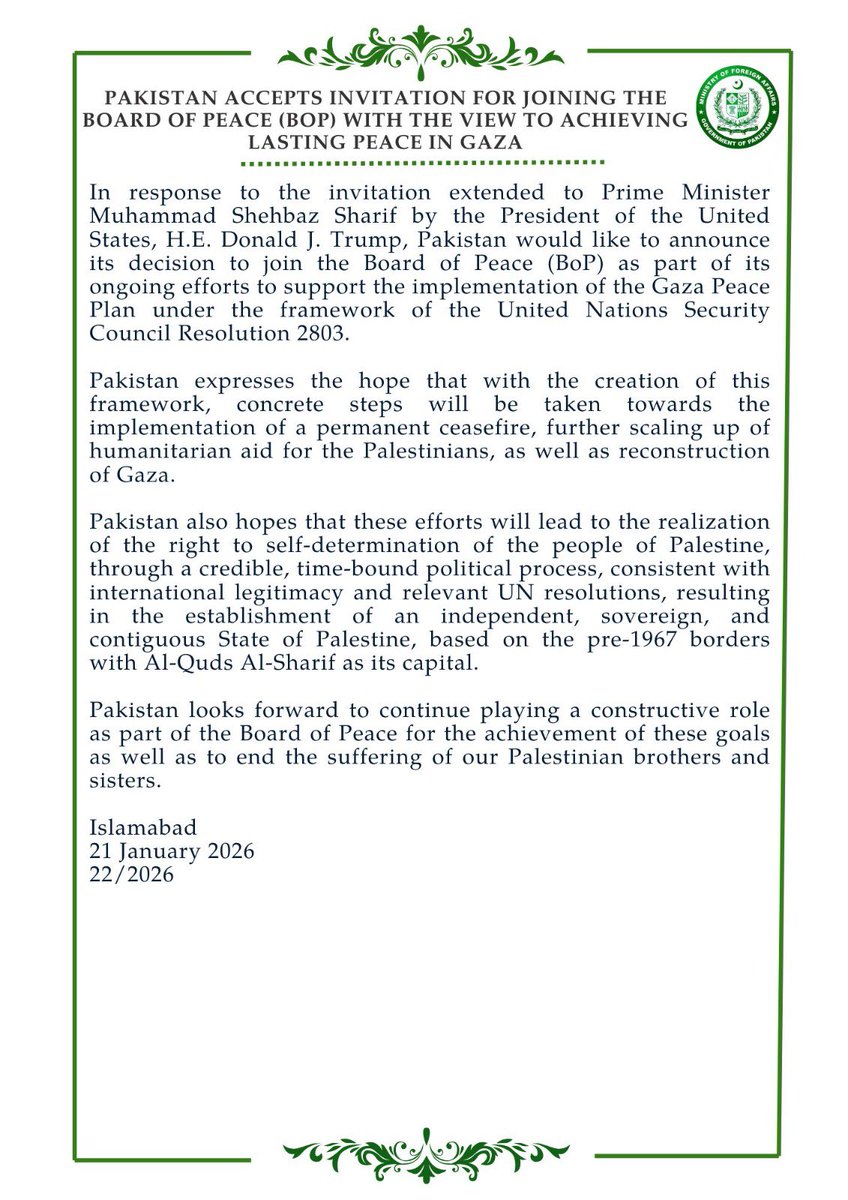 In an official statement, Pakistan said its decision to join the board reflects its ongoing efforts to support peace initiatives under the framework of the United Nations Security Council Resolution 2803.