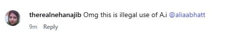 After the pictures went viral on social media, many social media users called out the Pakistani brand for forging Alia Bhatt’s pictures using AI (Artificial Intelligence). A person wrote, “alia bhatt ko pta ha brand shoot k bare (Does Alia Bhatt know about the brand shoot?)”. Another commented, “This is AI I will send this to her.” One more person expressed, “Omg this is illegal use of A.i @aliaabhatt.” One more user wrote, “This is fake ai cheap marketing.”