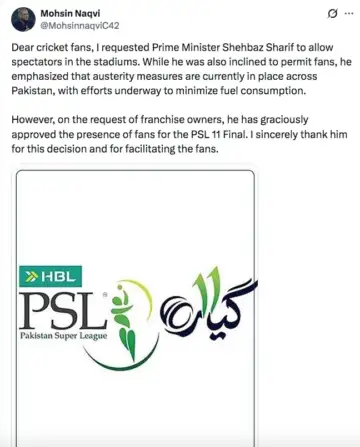 “However, on the request of franchise owners, he has graciously approved the presence of fans for the PSL 11 Final. I sincerely thank him for this decision and for facilitating the fans.”