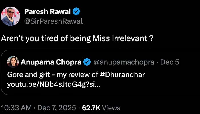 It throws light upon long-standing contention between filmmakers’ actors and critics-debate wherein constructive criticism ceases and undue harshness begins. With Dhurandhar yet very much in the fray for praise and condemnation, this Paresh Rawal-Anupama Chopra clash has amplified the film’s visibility ensuring that its conversation shall not cease soon.