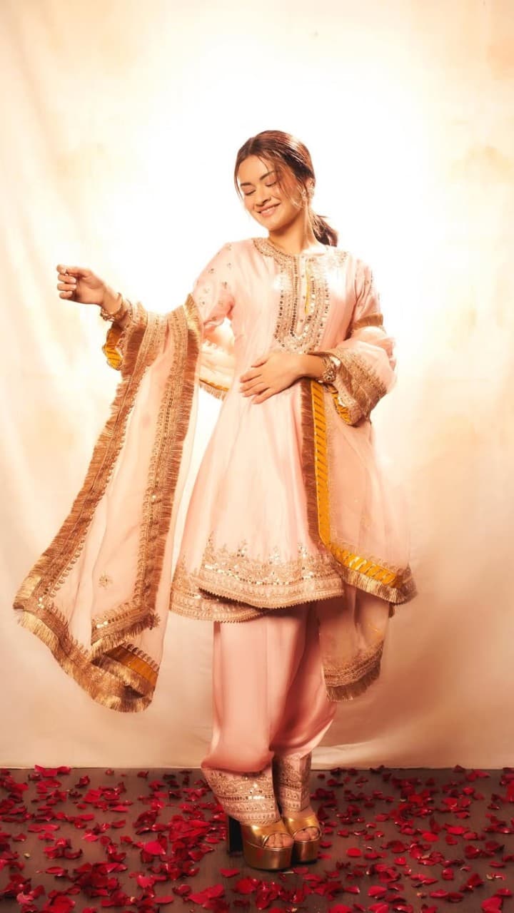 If you do not want to spend much money then choose full length kurti on printed pattern. Anveet has worn it with orange dupatta, you choose white dupatta. Pinkish makeup will bloom together.
