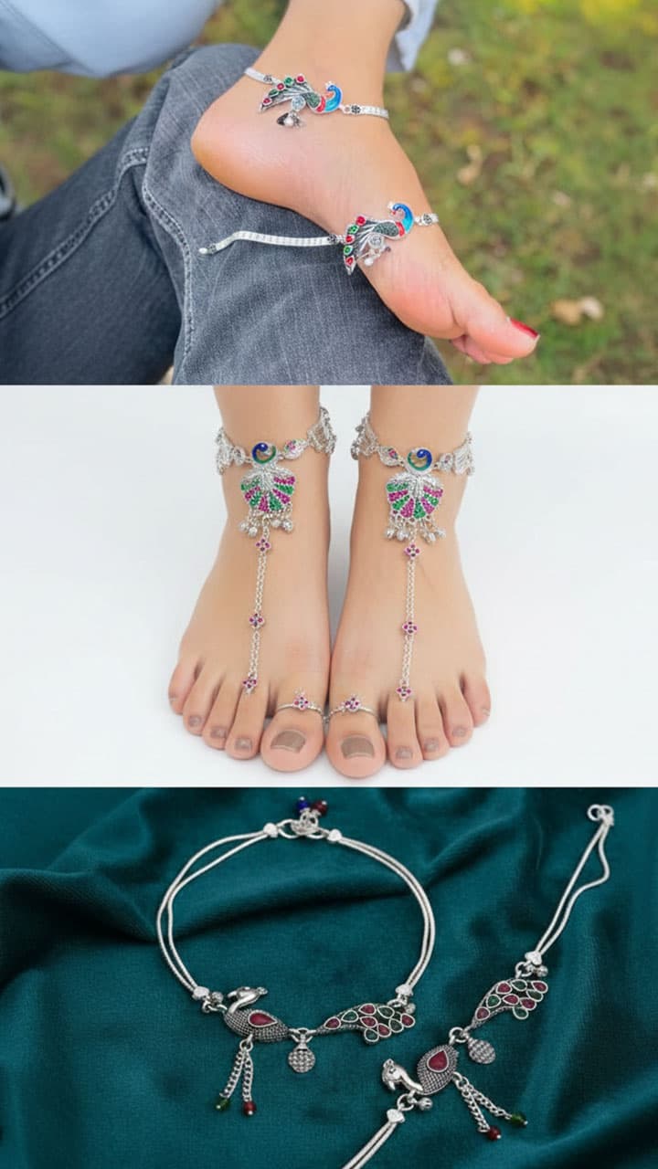 Peacock design anklets have a beautiful peacock pattern in the middle or on the side, which adds a different elegance and grace to the anklets. You should wear this type of anklet for a heavy look.