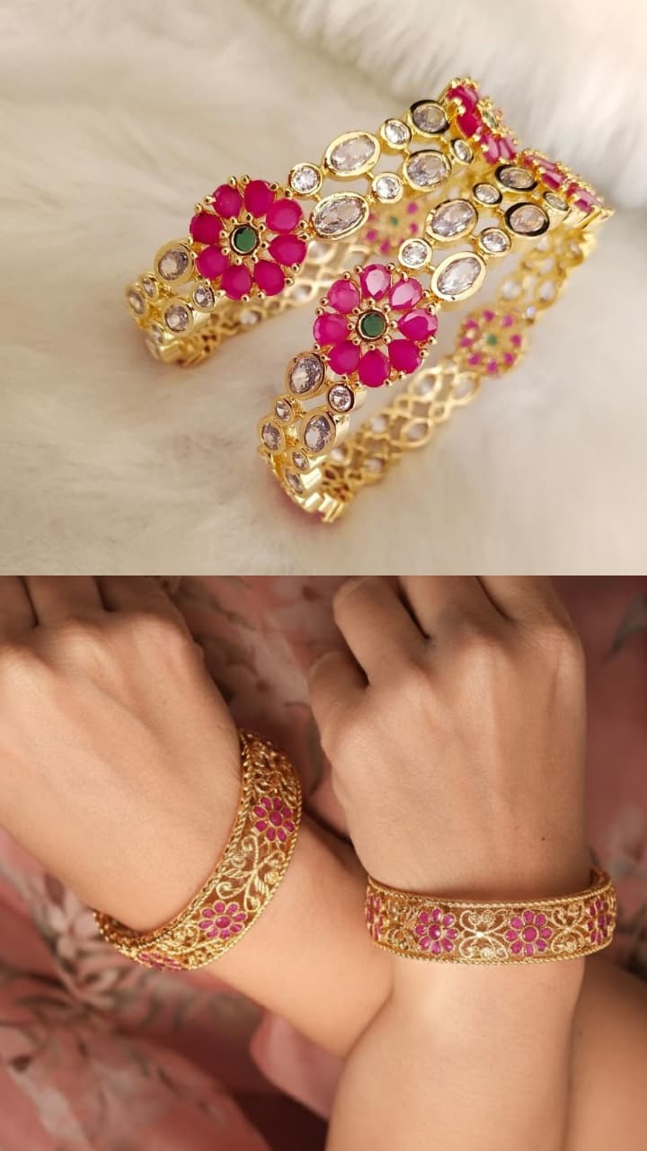 Pink Stone Bangle Designs: The trend of pink stone jewelery in 2025 is on everyone’s mind. Gold plated, floral and South Indian stone bangles with embroidered bracelets will give a royal touch. Look here, great design.