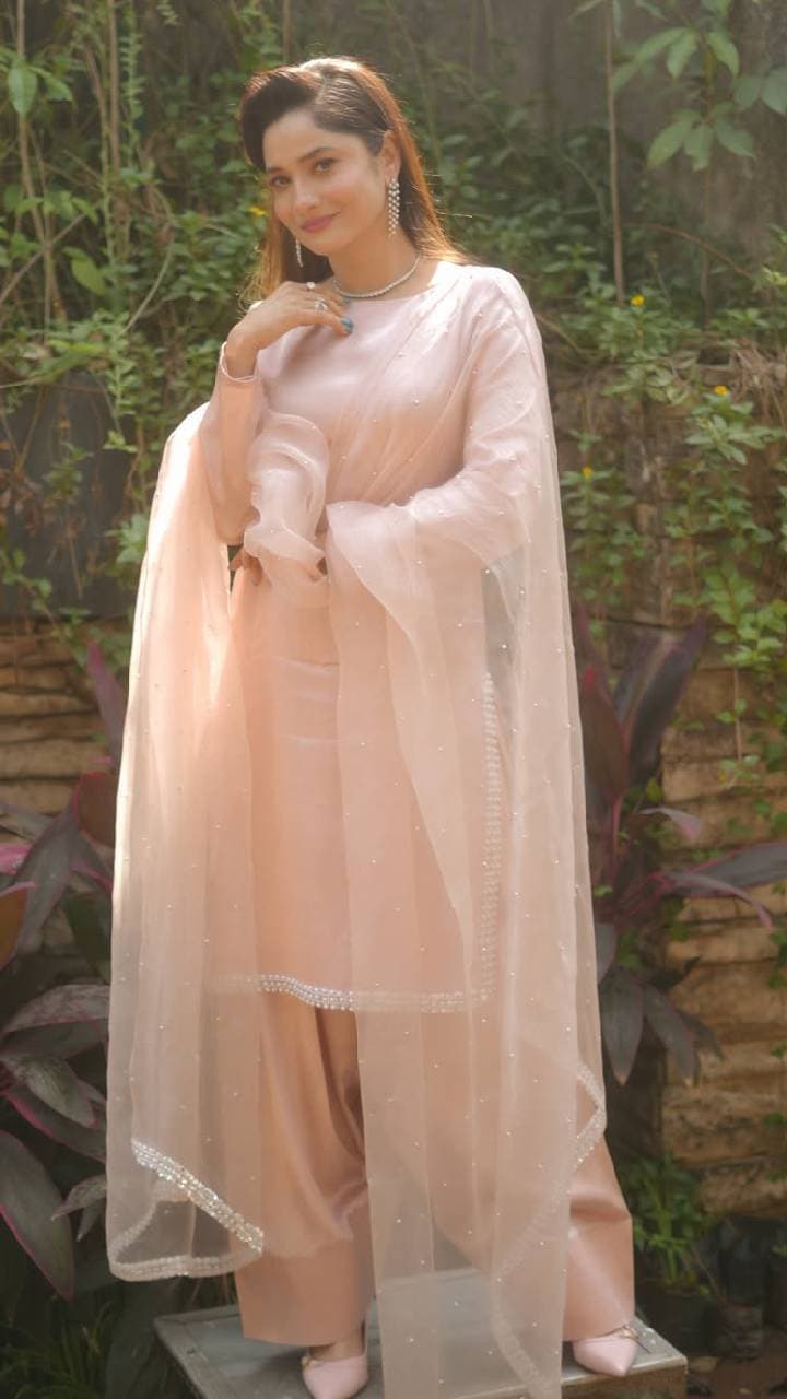 You can wear a plain silk suit instead of a heavy suit on special occasions in summer. Opt for a stone bottom look in a short suit from Ankita Lokhande.
