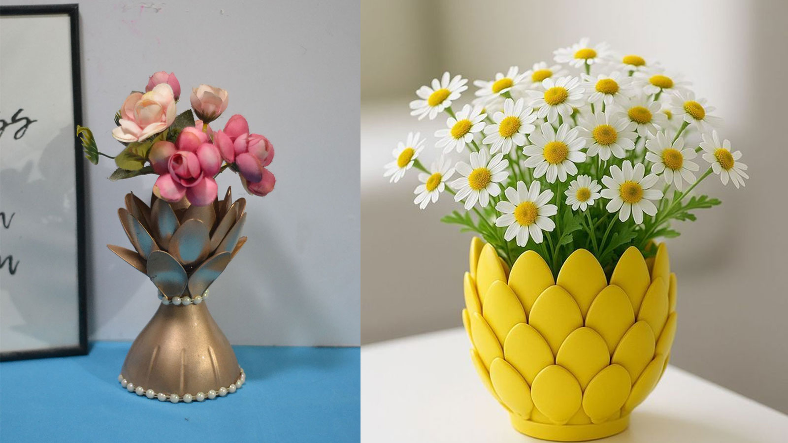 You can also use plastic spoons for flower pots. First of all, make a base by cutting the top part of a bottle. Keep sticking the spoons on it, cut its stem side. Now paint the entire pot golden. Make some pearl detailing, add real or artificial flowers to it and decorate the outside of the house.