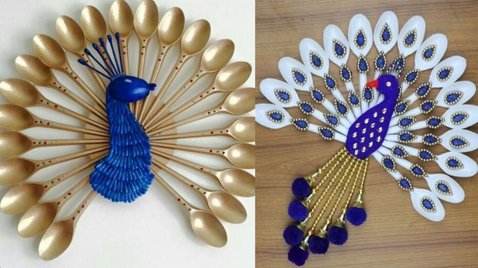 You can also make a very beautiful peacock with a plastic spoon. You can stick it on any wall of your house. First of all make a peacock face, use plastic spoons to make its wings. If you want, you can color it golden or leave these plastic spoons white and stick blue colored stones on it.