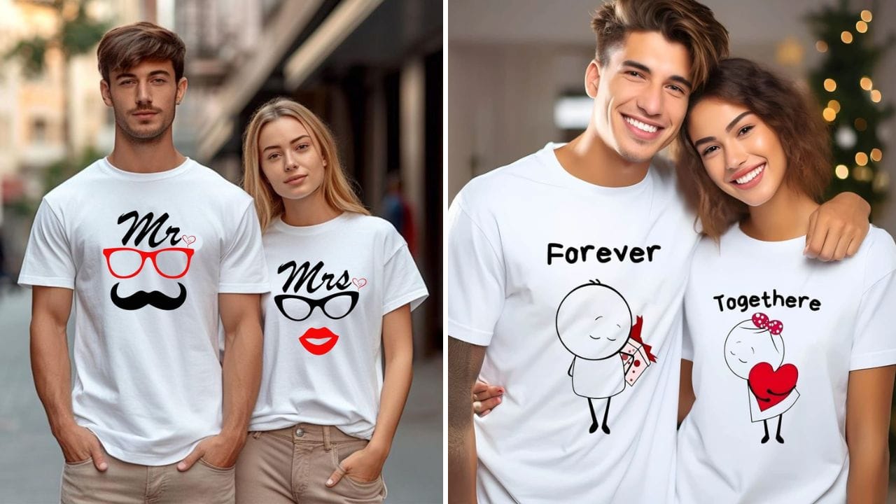 Couple dressing does not require identical outfits. Balanced coordination using similar colours, themes, or messages often works better. Simple T-shirt pairings suit daytime plans, while elegant silhouettes elevate evening dates. These twinning ideas offer flexible styling options that feel natural, expressive, and suitable for different Valentine’s Day moods. Scroll further to know.