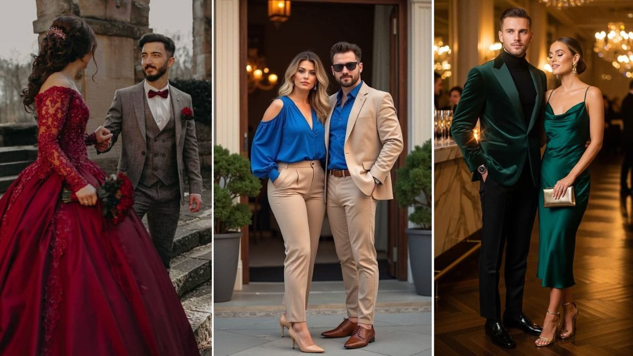 For upscale date nights, coordinated formalwear elevates couple styling. A burgundy ball gown paired with a greyish-brown coat, trousers, white shirt, red bow tie, and pocket rose creates a refined look. Other combinations include an elegant blue top with nude trousers paired with a nude suit and blue shirt, or a green body-hugging dress matched with a green coat and black trousers.