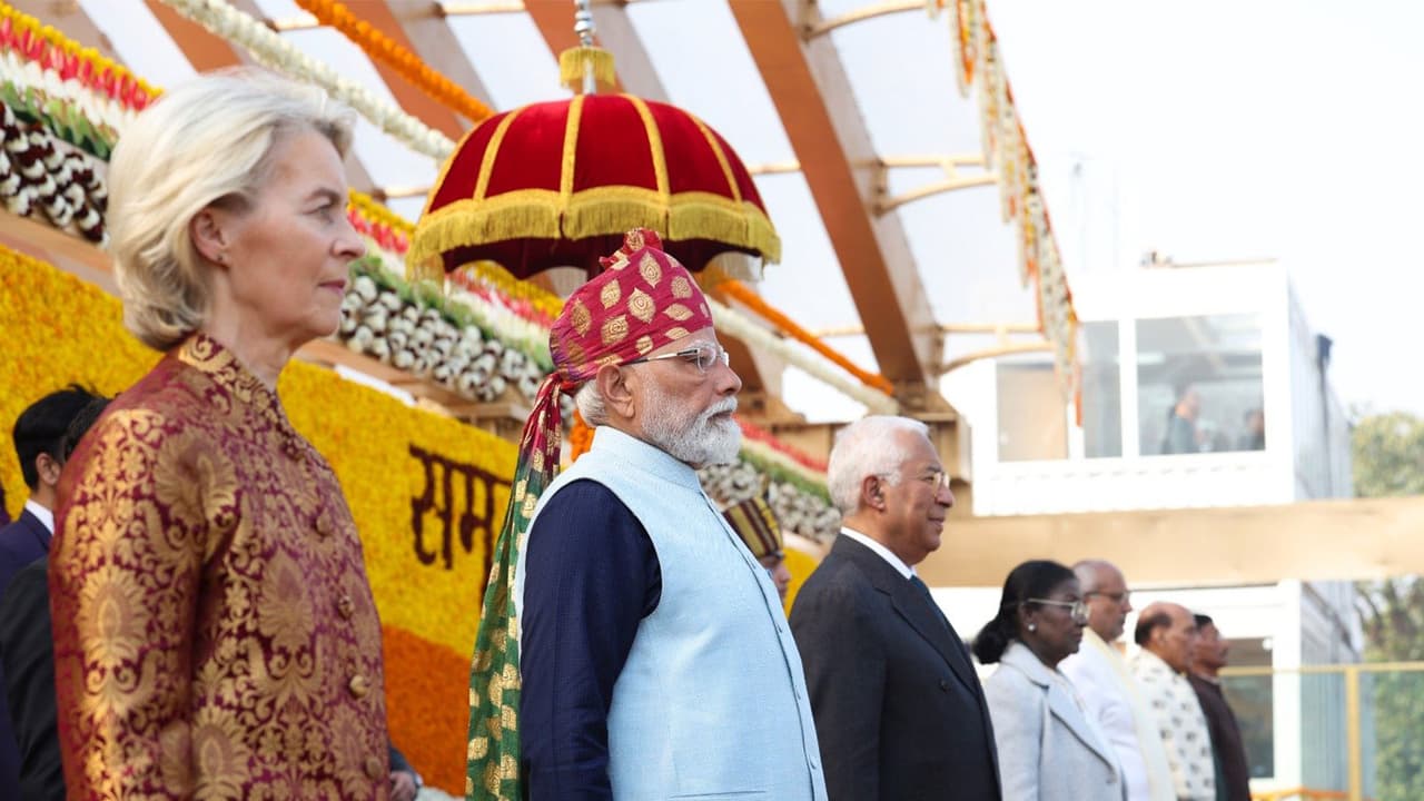 PM Modi welcomed EU leaders Ursula von der Leyen and Antonio Costa for India’s 77th Republic Day, hailing the growing India-EU partnership. Von der Leyen, a Chief Guest, called India a key global partner, enhancing strategic convergence.