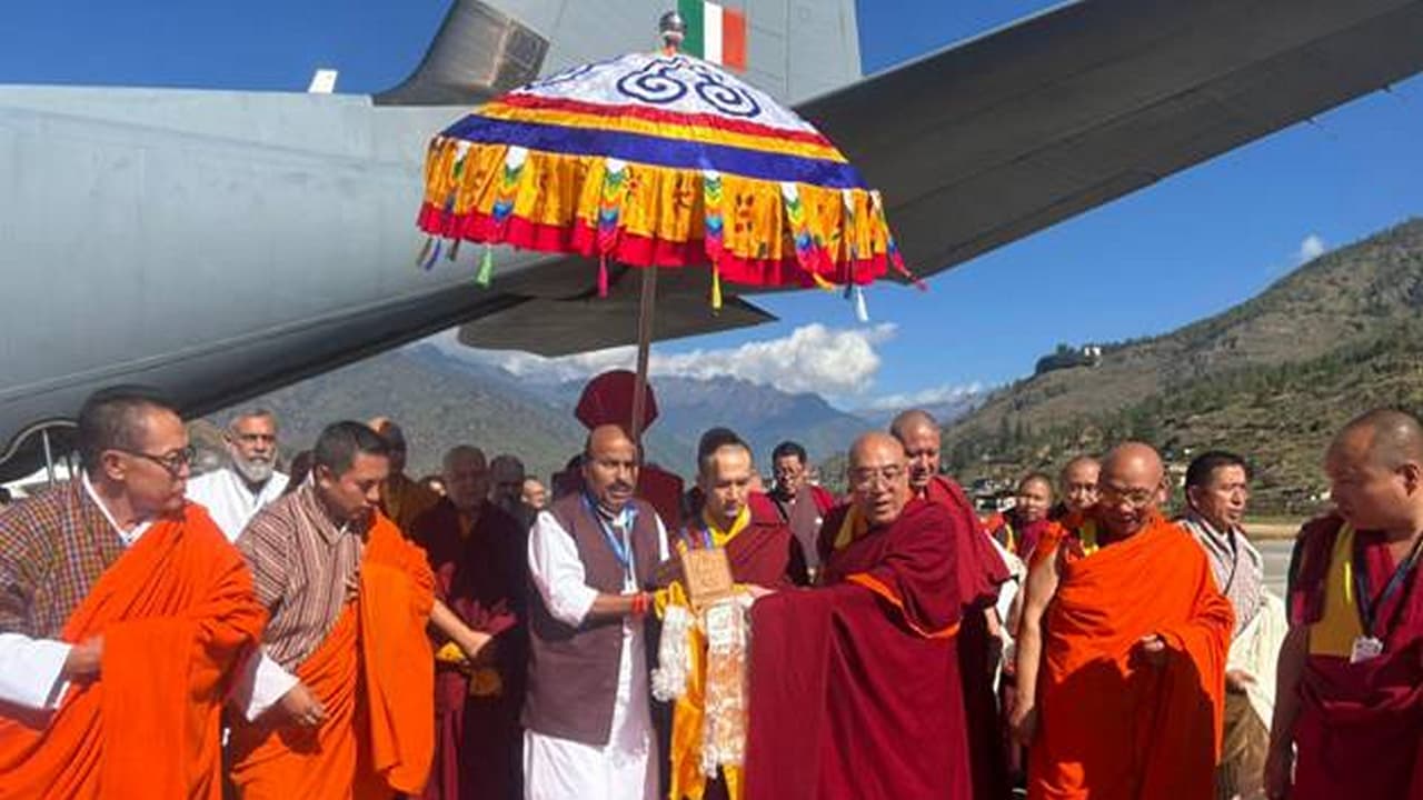 Upon arrival at Paro International Airport on November 8, the sacred relics were received with deep reverence by the Home Minister of the Royal Government of Bhutan, Tshering, Tshoki Lopen of the Central Monastic Body of Bhutan, and the Mayor of Paro (Dzongkhag) Norbu Wangchuk, Ambassador of India to Bhutan Sandeep Arya and senior officials and monks from Bhutan. The Royal Queen Mother Dorji Wangmo Wangchuck and Prince Jigyel Ugyen Wangchuck also paid their respects to the holy relics during the ceremony.