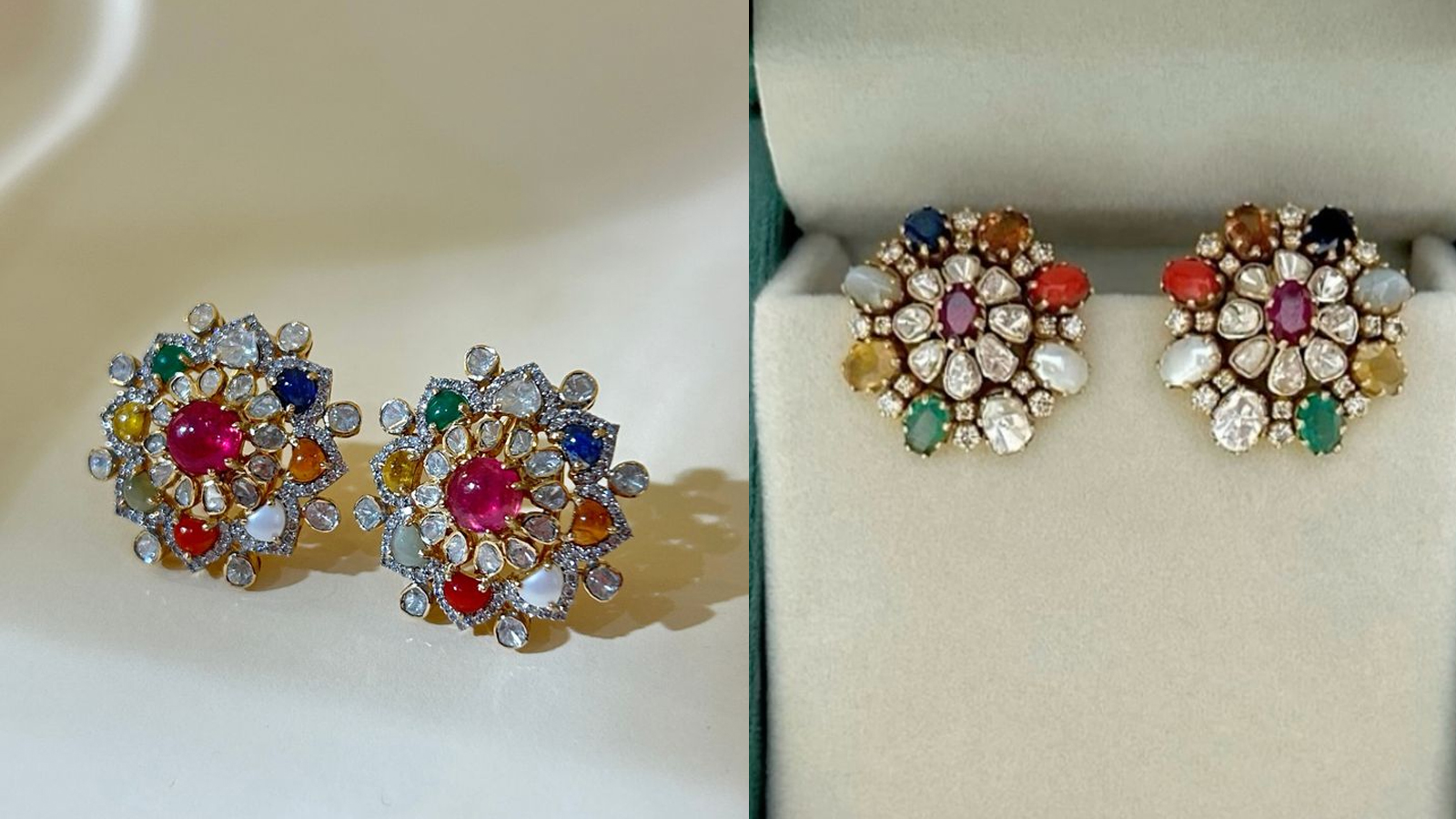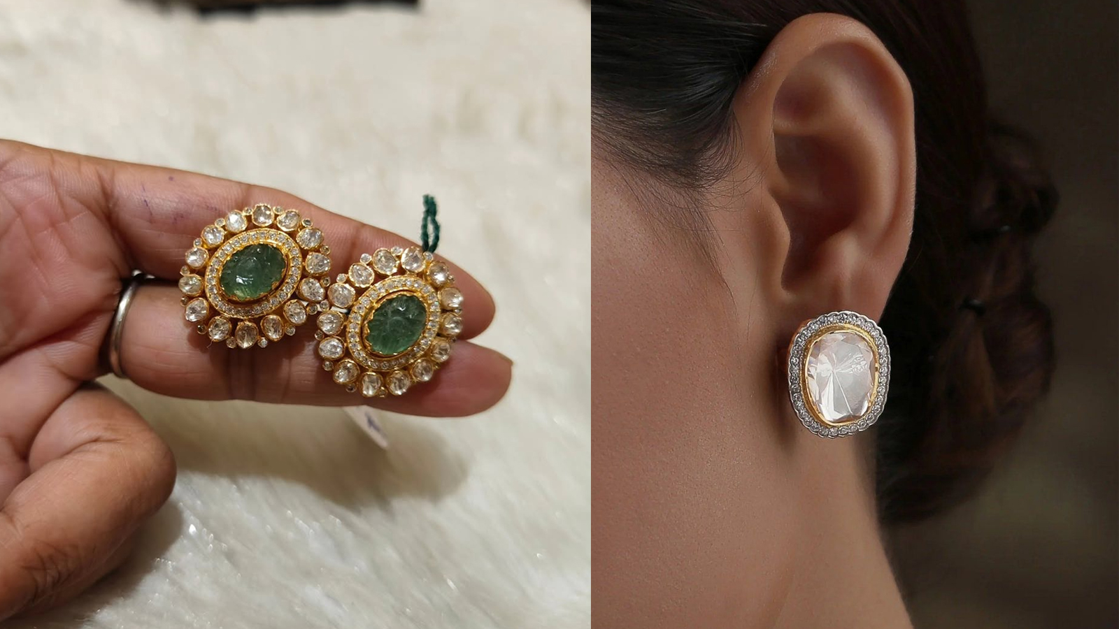 Stones like Emerald and Ruby look very beautiful with Polki earrings. You can choose oval shaped emerald earrings detailed with polki on each side or you can also choose stud earrings with a big polki with diamond detailing on each side.