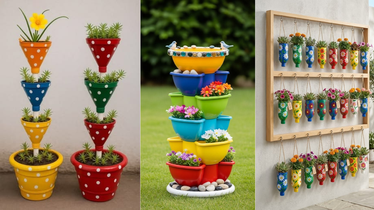 If you already have clay pots in the garden, then without thinking too much, make a funnel tower planter. For this, connect the upper part of the plastic bottle with a cutter and plant it in the pot. It is also called Tiered Planter. Instead of plain paint, make colorful designs in them, which will give an elegant and modern look.