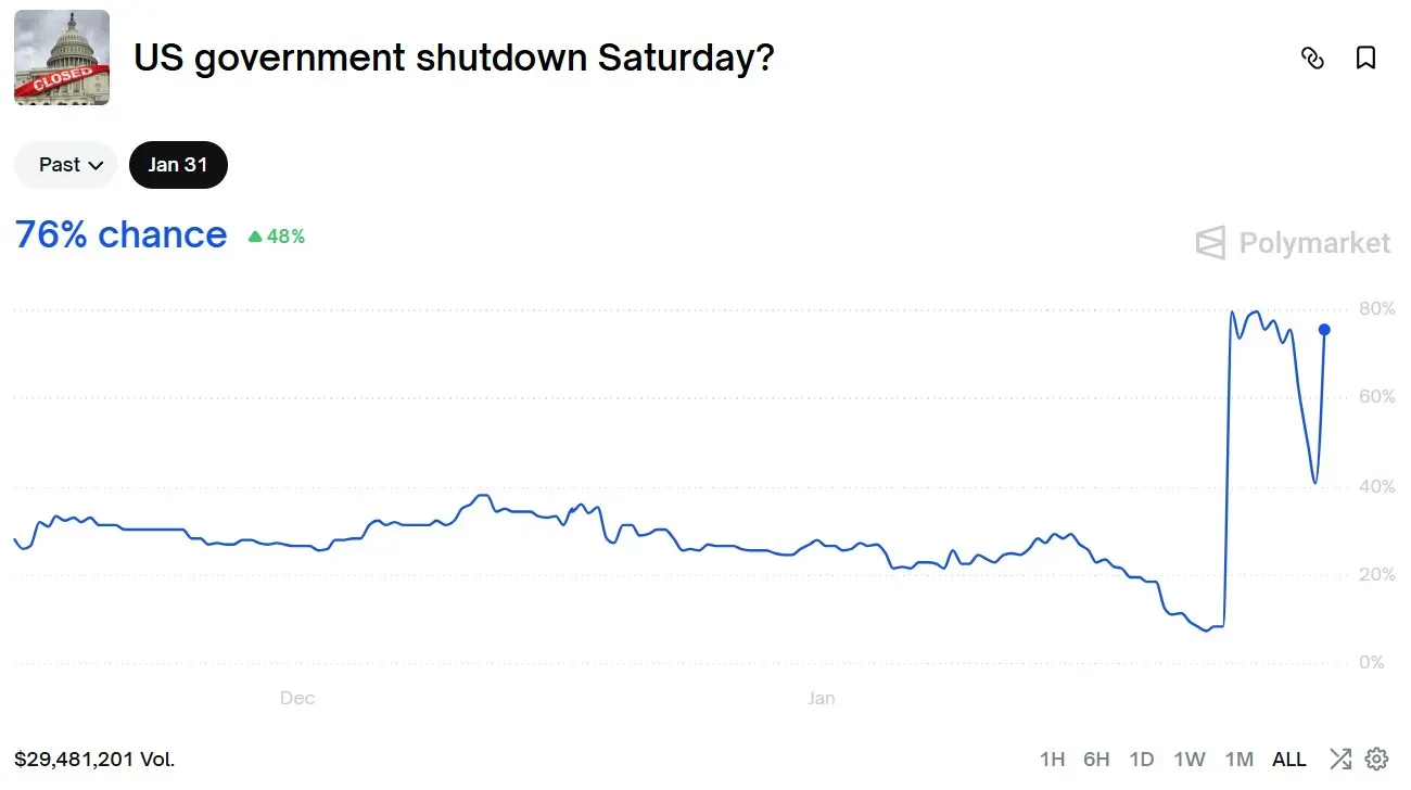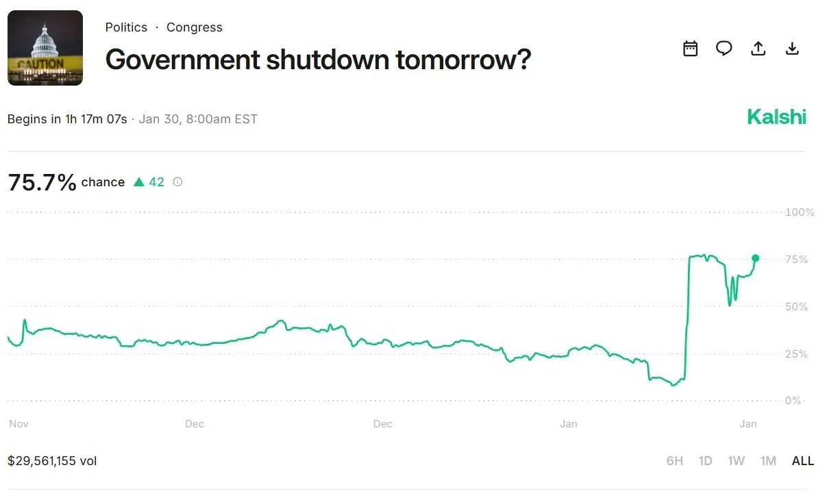 At the time of writing, odds on Kalshi and Polymarket indicated a 76% likelihood of a U.S. government shutdown.