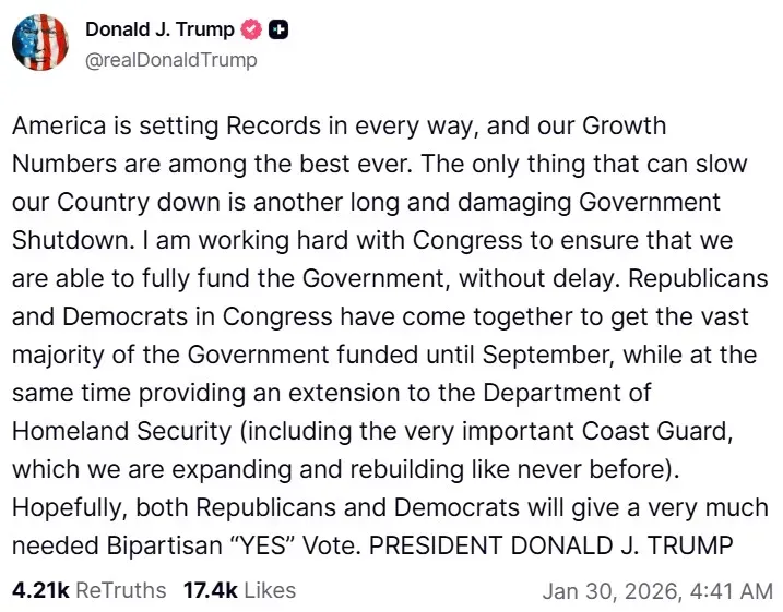 In a post on Truth Social, President Donald Trump endorsed the deal reached between Senate leaders on Thursday.
