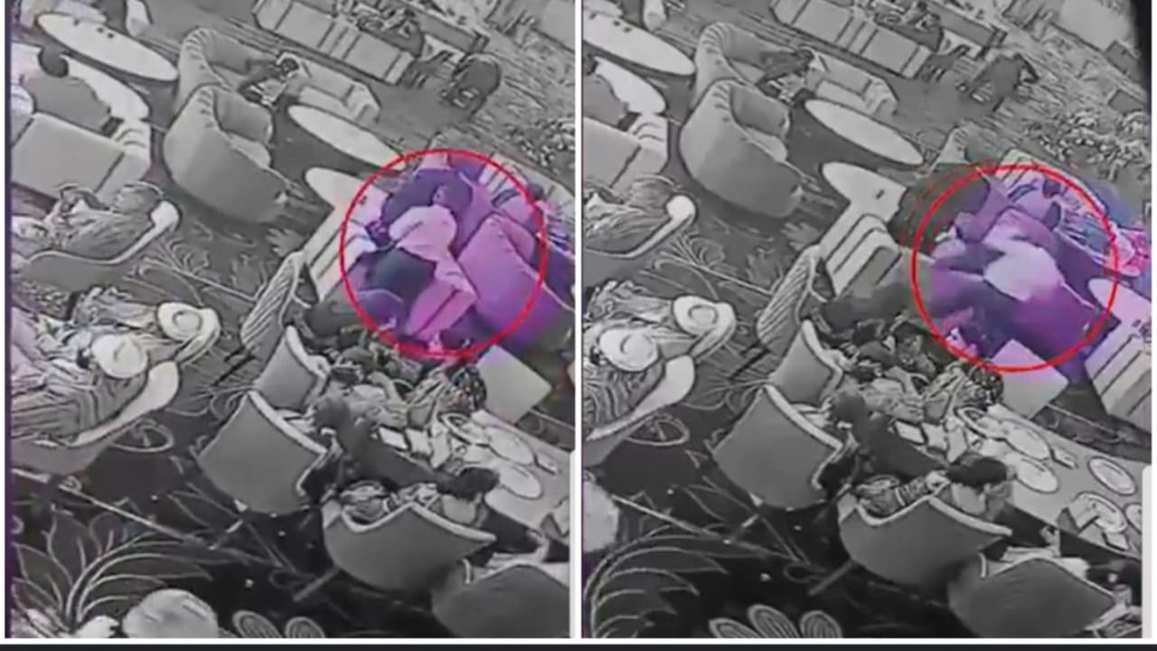 The footage reveals a well-dressed young man casually strolling through the packed hall, among other guests. He then approaches an unsuspecting man from behind and briefly pauses, appearing to scan the surroundings before making his move.