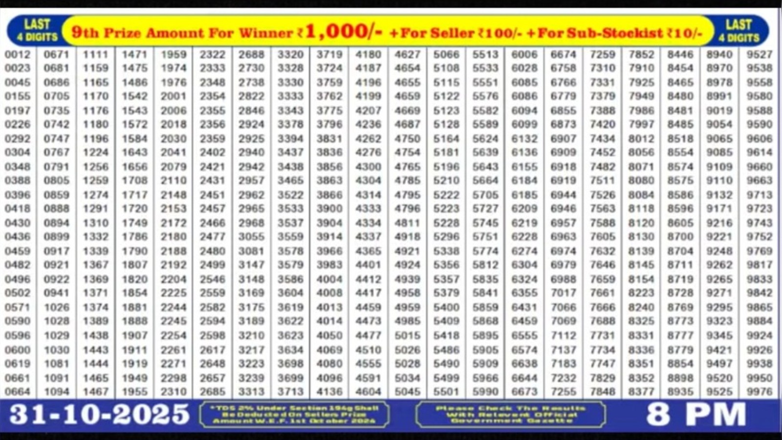 - Punjab Lottery Diwali Bumper 2025 (9th Winner): 0012, 0671, 1111, 1471, 1959, 2322, 2688, 3320, 3719, 4180, 4627, 5066, 5513, 6006, 6674, 7259, 7852, 8446, 8940, 9527, 0023, 0681, 1156, 1974, 2333, 2730, 3382, 3724, 4187, 4664, 5108, 5533, 6028, 6758, 7310, 7910, 8458, 8942, 9583, 0045, 0686, 1180, 1982, 2348, 2733, 3389, 3736, 4190, 4665, 5120, 5568, 6068, 6779, 7375, 7948, 8470, 8970, 9588, 0155, 1170, 1542, 2001, 2354, 2822, 3333, 3762, 4199, 4695, 5122, 5576, 6086, 6779, 7397, 7948, 8472, 8980, 9632, 0218, 1176, 1584, 2014, 2362, 2944, 3343, 3776, 4211, 4709, 5131, 5586, 6106, 6803, 7402, 7984, 8506, 9023, 9677, 0292, 0177, 1189, 1643, 2043, 2395, 2946, 3431, 4226, 4750, 5164, 5612, 6132, 6907, 7430, 8012, 8518, 9056, 9688, 0348, 0791, 1256, 1668, 2047, 2396, 2948, 3486, 4306, 4765, 5196, 5643, 6186, 6917, 7442, 8051, 8544, 9106, 9711, 0412, 0817, 1278, 1710, 2144, 2451, 2962, 3488, 4314, 4795, 5222, 5706, 6198, 6940, 7453, 8074, 8574, 9108, 9718, 0436, 0888, 1291, 1720, 2153, 2457, 2966, 3533, 3300, 4333, 4796, 5223, 5727, 6949, 7563, 8118, 8606, 9171, 9723, 0438, 0894, 1307, 2187, 2470, 2955, 3553, 3300, 4347, 4819, 5224, 5731, 6273, 6994, 7564, 8118, 8616, 9172, 9725, 0492, 0923, 1369, 1820, 2244, 2546, 3148, 3586, 4044, 4417, 4939, 5378, 5835, 6324, 6976, 7669, 8143, 8718, 9266, 0500, 1028, 1398, 1887, 2254, 2584, 3186, 3622, 4044, 4473, 4985, 5408, 5845, 6459, 7069, 7688, 8325, 8773, 9325, 0590, 1093, 1443, 1911, 2287, 2617, 3225, 3688, 4060, 4510, 5026, 5489, 5905, 6624, 7183, 7747, 8361, 8847, 9427, 0661, 1094, 1465, 1949, 2298, 2687, 3239, 3699, 4096, 4591, 5044, 5499, 5969, 6644, 7232, 7829, 8387, 8935, 9525, 0664, 1094, 1467, 1955, 2310, 2685, 3313, 3713, 4136, 4604, 5045, 5501, 5990, 6673, 7256, 7484, 8377, 8935, 9525, 9976