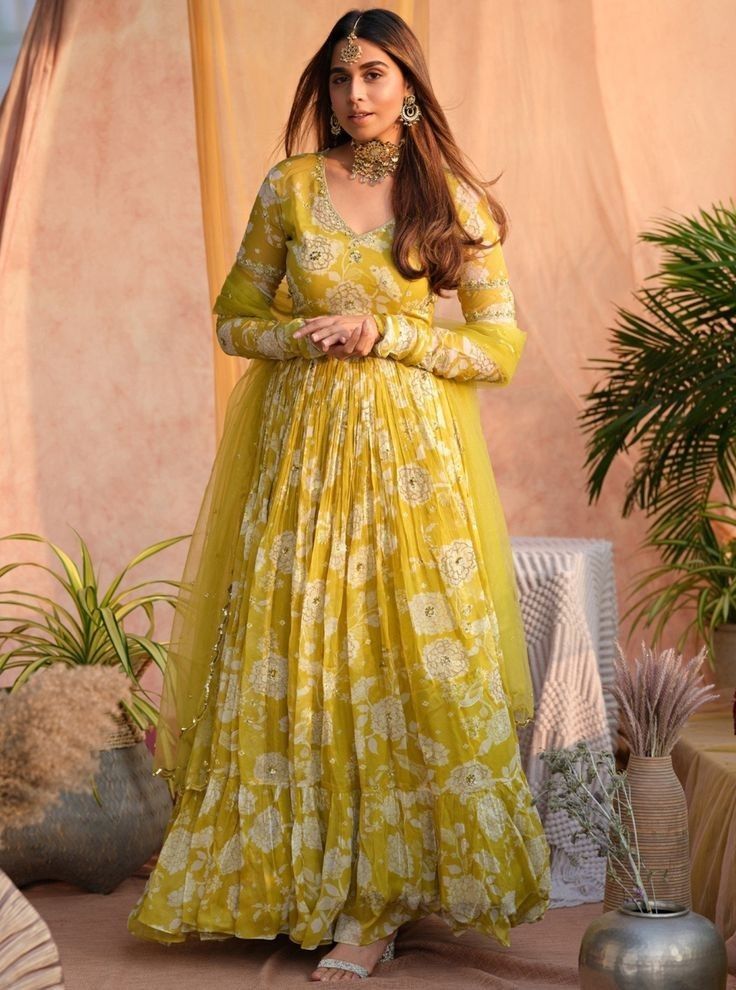 A floral-printed anarkali in soft fabrics such as kota offers a breezy option for intimate celebrations at home. Light prints and pastel tones keep the mood cheerful. Pair it with minimal earrings and classic heels for a balanced festive appearance.