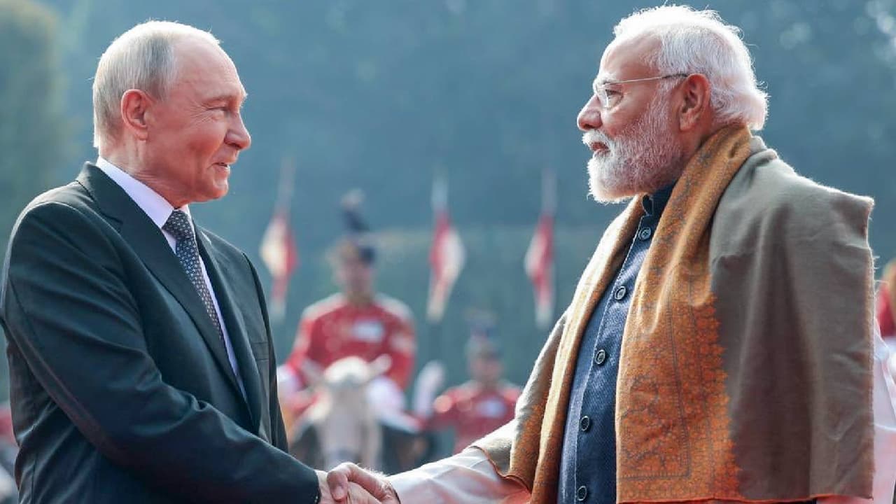 Prime Minister Narendra Modi shakes hands with Russian President Vladimir Putin during a ceremonial welcome at Rashtrapati Bhavan in New Delhi on Friday. President Draupadi Murmu and other dignitaries were also present.