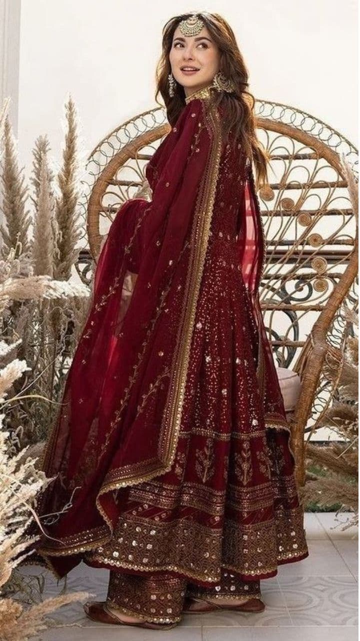 The design of this velvet pant and suit in maroon color is inspired by the Pakistani look. If you want to look a little different from the Indian look, then you can try this type of suit.