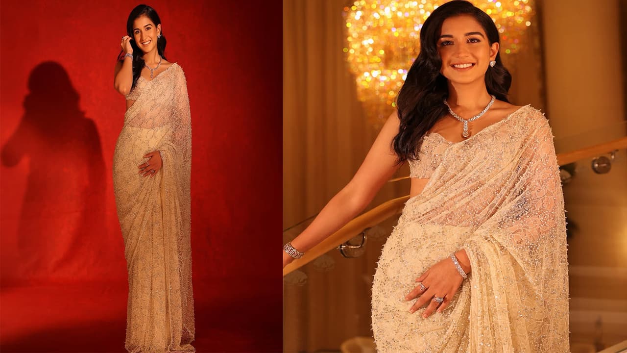 Radhika Merchant spread royal charm in vintage lace saree, Saree’s connection dates back to 1980. Radhika Merchant Wore Vintage Lace Saree In Diwali Party 2025
