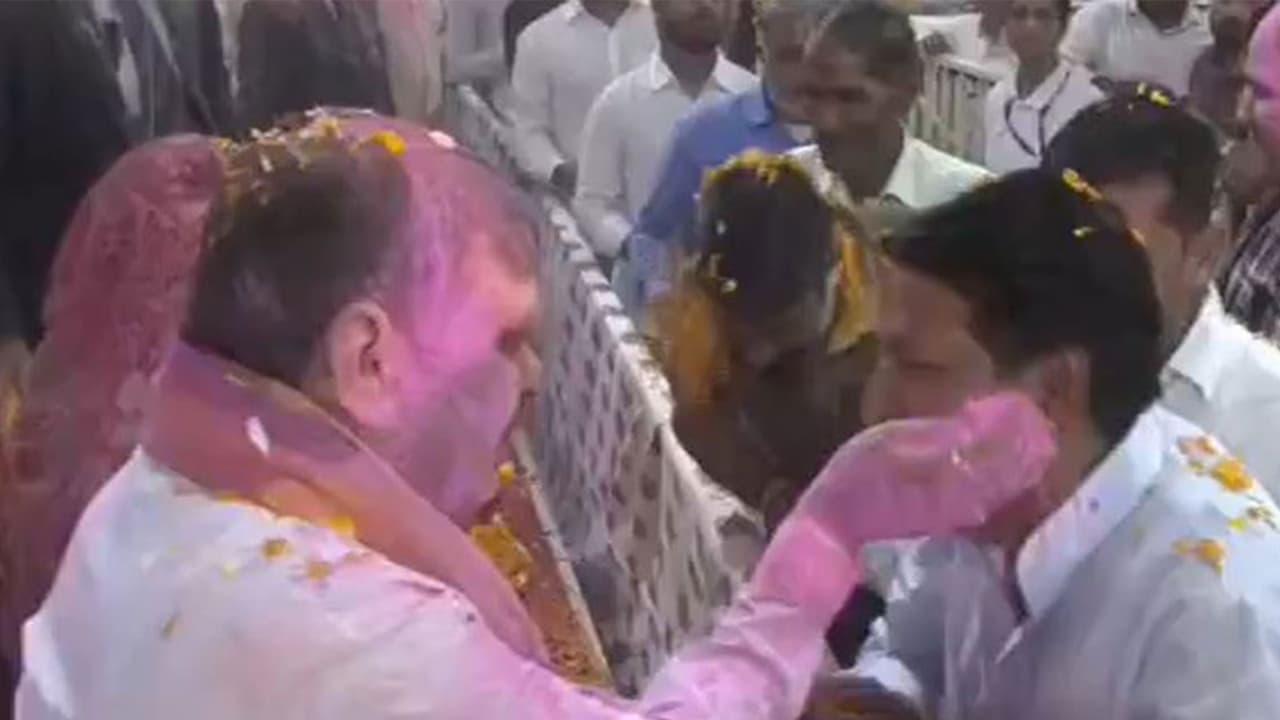 Visuals from the celebration show the Chief Minister, dressed in a traditional white kurta and actively engaging with the enthusiastic gathering. He was also seen leaning over from the stage to apply pink and yellow gulal to the faces of attendees as his own attire gradually became smeared with vibrant colours as well as flower petals amid cheers and laughter.