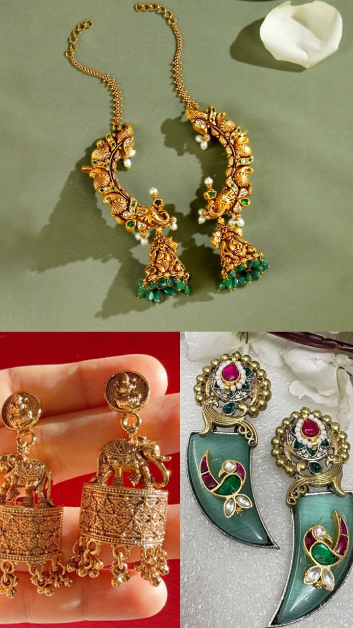 By using red, green, blue colored stones in Rajwadi Jhumki, you can wear this type of earrings pattern in any wedding, party or occasion. This saree, suit or lehenga suits everyone.