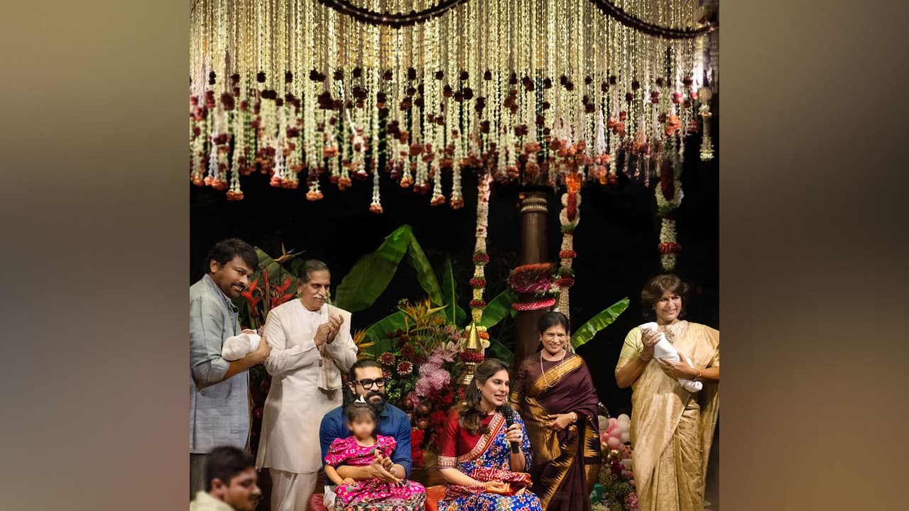 Along with the post, Chiranjeevi also shared a picture which shows Ram Charan and Upasana seated on chairs, with their eldest daughter, Klin Kaara, comfortably accompanying her father. Their parents joined the frame as the entire family came together for the naming ceremony of the twins.