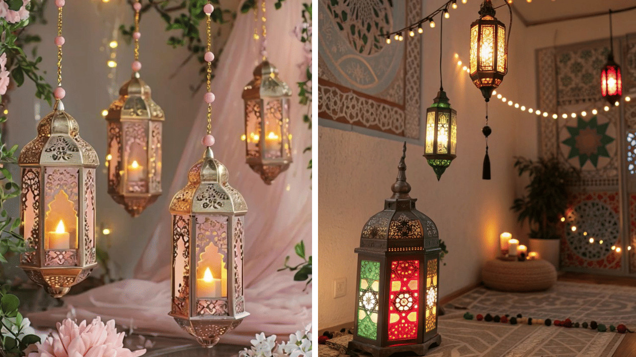 Classic metal or glass lanterns symbolise light during fasting; suspend them from ceilings or place on tables with fairy lights inside for a mesmerising glow. Perfect for entryways or balconies, they create a welcoming Ramadan Kareem ambiance, evoking Egyptian traditions and ideal for iftar photo backdrops—budget-friendly with plastic bottle DIY versions.