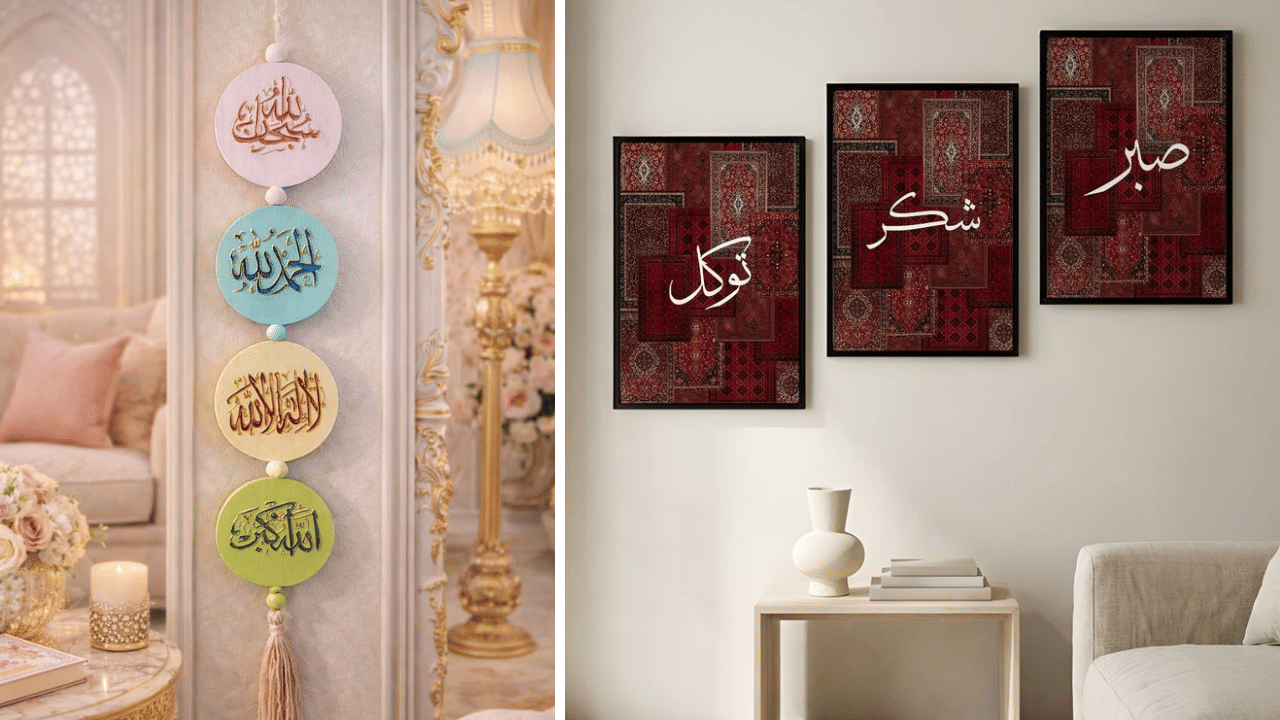 Frame prints of Quranic verses, “Ramadan Mubarak,” or Ayatul Kursi in metallic frames for instant elegance. Opt for modern metal or wooden pieces; they inspire reflection, suiting living rooms or hallways and pairing beautifully with cushions in maroon and gold for cohesive decor.