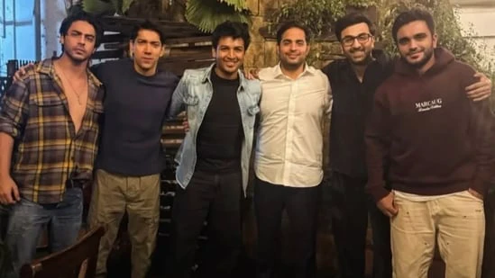 Aryan is dressed in a casual plaid shirt, slightly unbuttoned, paired with jeans, while Ranbir sports a black shirt and glasses. The group appears cheerful, with most of them smiling for the camera. Akash is seen wearing a simple white shirt with black trousers.