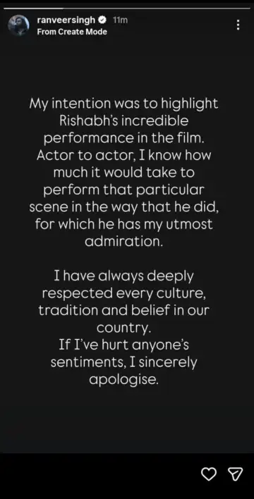 On Tuesday morning, Ranveer took to Instagram and shared a note of apology on Stories. It read, “My intention was to highlight Rishabh’s incredible performance in the film. Actor to actor, I know how much it would take to perform that particular scene in the way that he did, for which he has my utmost admiration.”