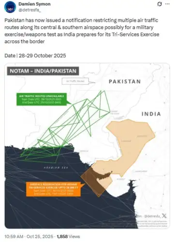 Satellite images shared by analyst Damien Symon showed the airspace reserved for the Trishul exercise extends up to 28,000 feet, in what is being billed as one of the most significant joint operational drills in recent years. Symon tweeted that the selected area and scale of operations were “unusual”.