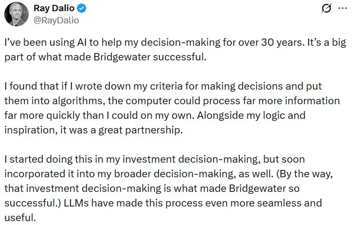 In a post on X, Dalio explained that he realized that if he fed his criteria and principles for making a decision to an algorithm and equations, and aligned the “expert system” with his intellect, the system would process much more complex information much faster.
