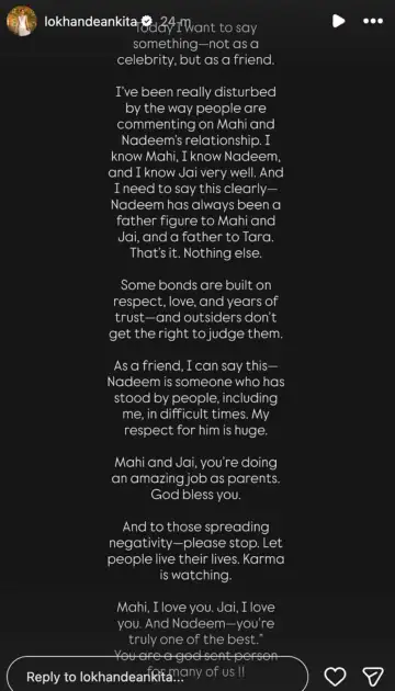 She wrote, “Today, I want to say something-not as a celebrity, but as a friend. I’ve been really disturbed by the way people are commenting on Mahi and Nadeem’s relationship. I know Mahi, I know Nadeem, and I know Jai very well. And I need to say this clearly- Nadeem has always been a father figure to Mahi and Jai, and a father to Tara. That’s it. Nothing else.”