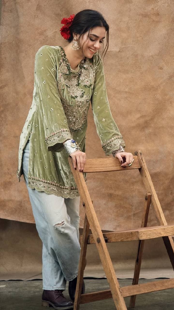 Keerthi Suresh’s style: In winter, you can wear velvet embroidered kurti with loose jeans. It also looks superb and can be worn easily. Wear minimal jewelery also.