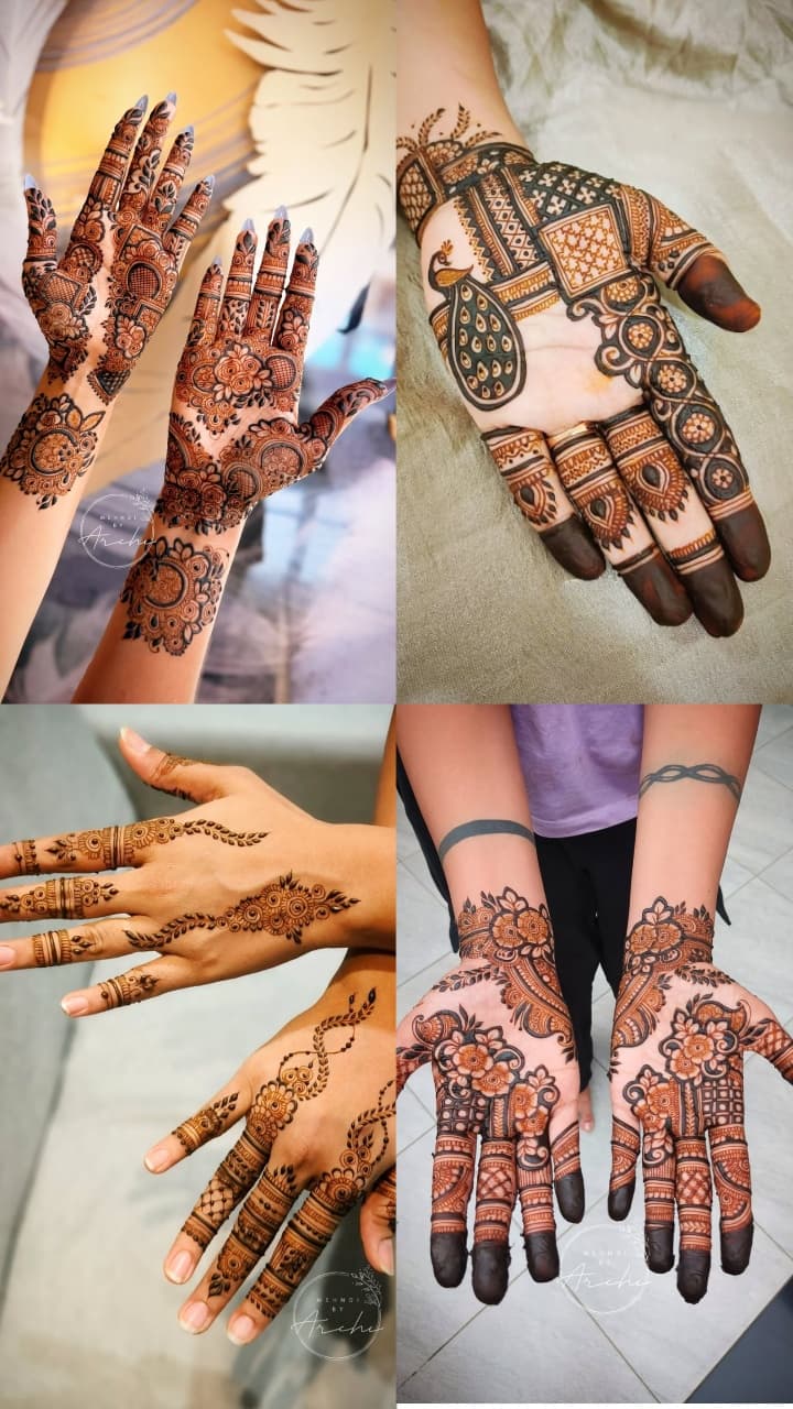 This mehendi with peacock and arabesque patterns is great for one hand mehendi on Makar Sankranti. The mesh work on the edges is making it aesthetic. You can try it with saree and lehenga.