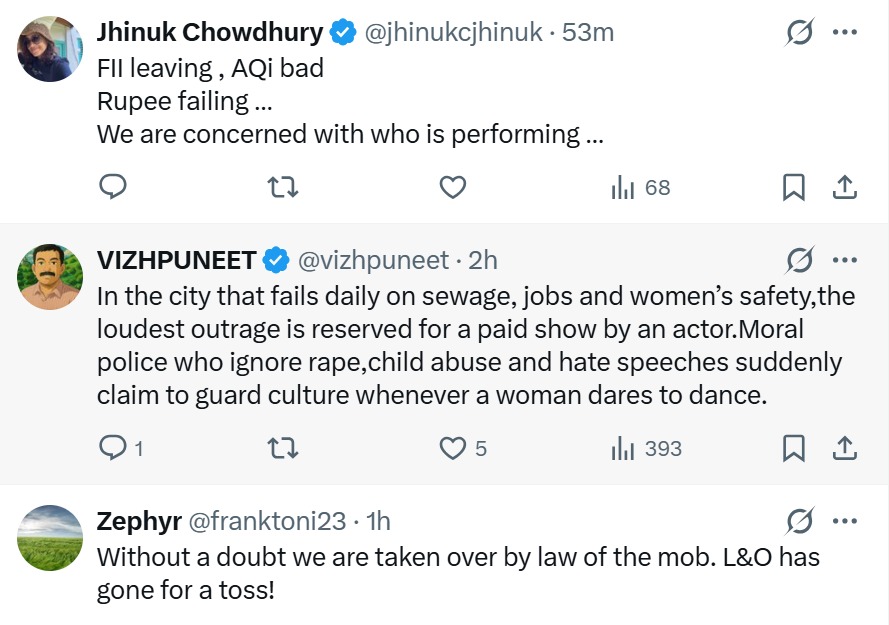 One user wrote that the city struggles daily with sewage problems, unemployment, and women’s safety, yet the strongest outrage was over a paid performance by an actor. The user accused moral police of ignoring serious crimes while targeting women who perform on stage.