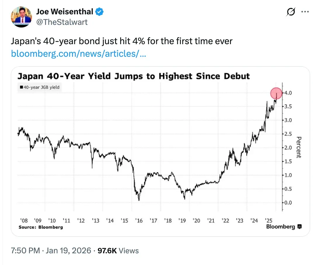 ​Coupled with these on-chain metrics is the macro signal of Japan’s 40-year bond yield hitting 4% for the first time, which is tightening global financial conditions. Analysts noted that risk assets are now under macro pressure.